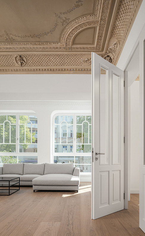Mit der Aktivierung einer Aufstockung als Staffelgeschoß und dem großflächigen Ausbau des Gartengeschosses erstrecken sich nun drei Wohneinheiten über fünf Etagen. Die 2-geschossige Beletage-Einheit ist zudem mit einer Einliegerwohnung schaltbar und verfügt über einen exklusiven Zugang zum rückwärtigen Garten. So kann modernes Stadtleben im 21. Jahrhundert aussehen.